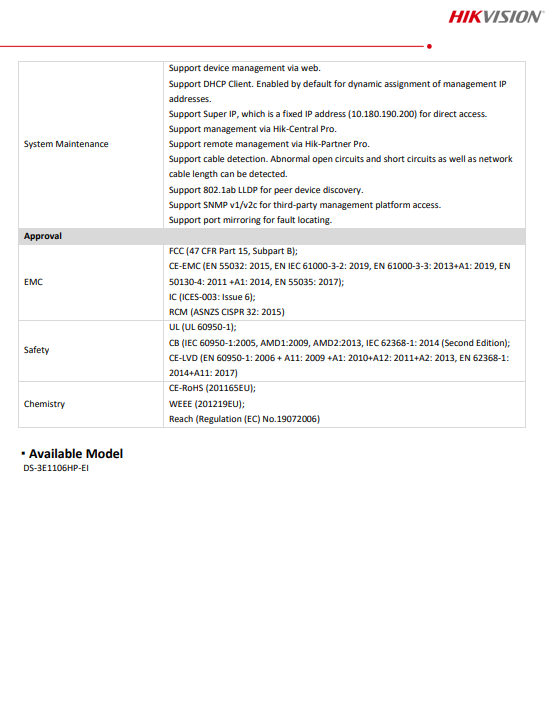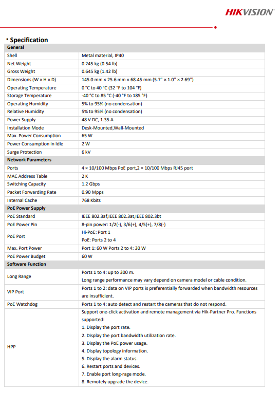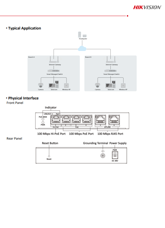 4 × 100 Mbps PoE RJ45 ports, 2 × 100 Mbps network RJ45 ports