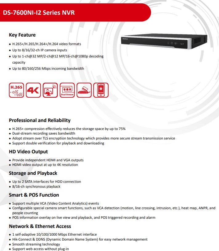 ความสามารถในการถอดรหัสสูงสุด 1-ch@32 MP/2-ch@12 MP/16-ch@1080p
