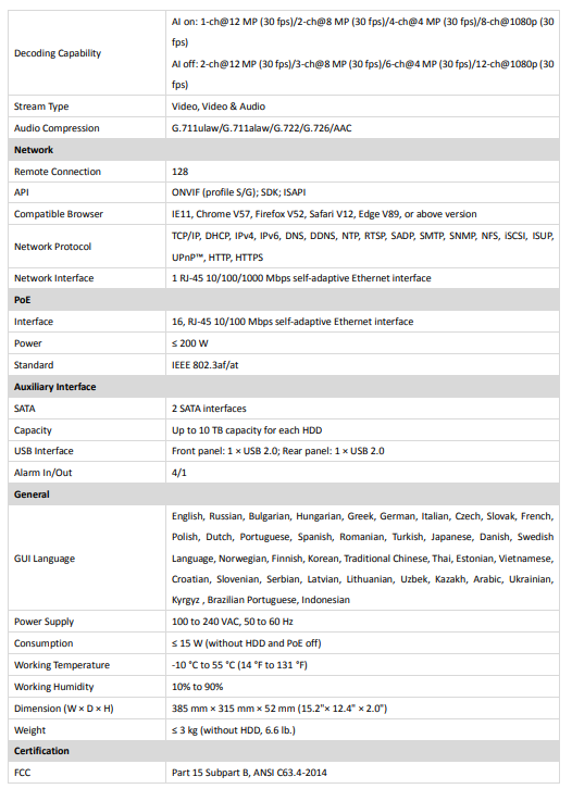 ความสามารถในการถอดรหัสสูงสุด 2-ch@12 MP หรือ 3-ch@8 MP หรือ 6-ch@4 MP หรือ 12-ch@1080p