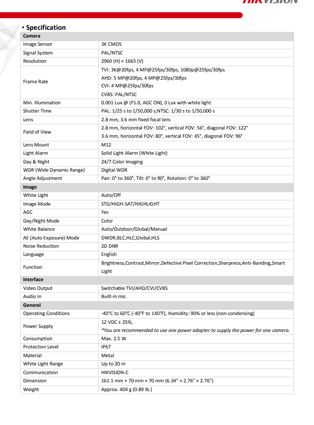 2.8 mm, 3.6 mm, 6 mm fixed focal lens