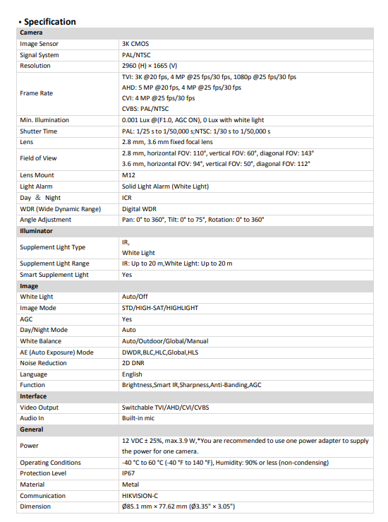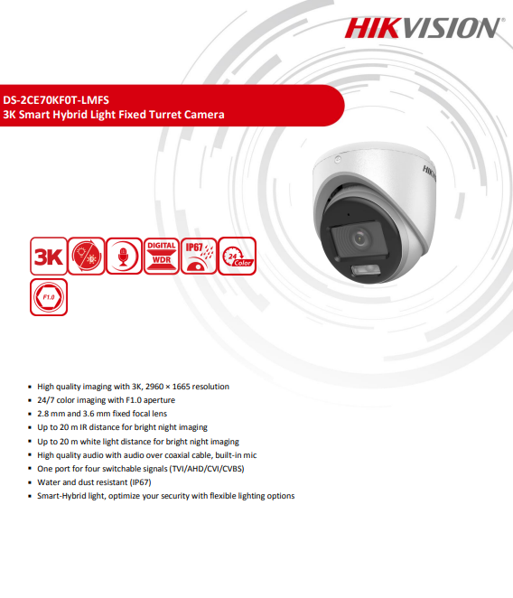 Hikvision ColorVu 3k กล้องวงจรปิด รุ่น DS-2CE70KF0T-LMFS 2.8