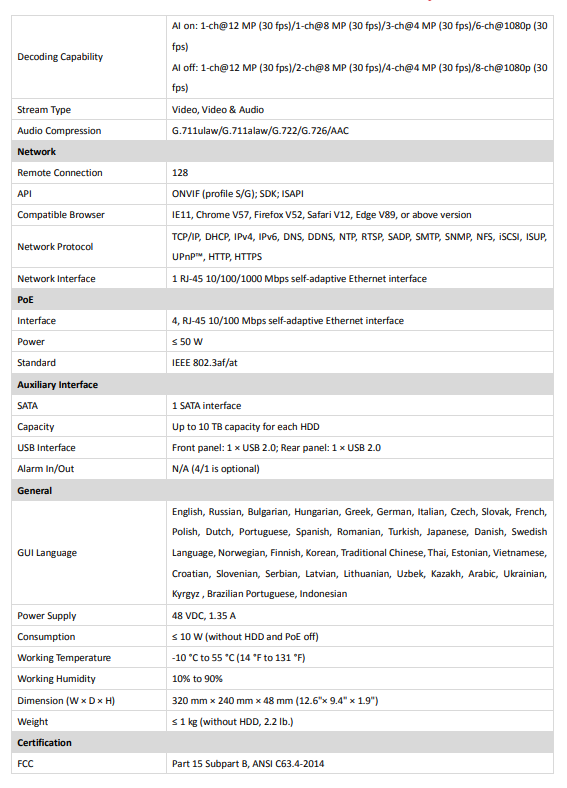 ความสามารถในการถอดรหัสสูงสุด 1-ch@12 MP หรือ 2-ch@8 MP หรือ 4-ch@4 MP หรือ 8-ch@1080p